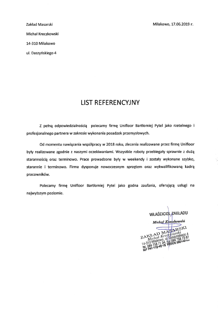 Z pełną odpowiedzialnością polecamy firmę Unifloor Bartłomiej Pytel jako rzetelnego i profesjonalnego partnera w zakresie wykonania posadzek przemysłowych.